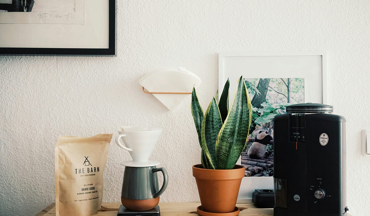 Un rincón de café en casa puede ser un pequeño santuario: molinos manuales, frascos con granos recién tostados, bandejas de madera y tazas de cerámica artesanal. El entorno se convierte en parte de la experiencia.